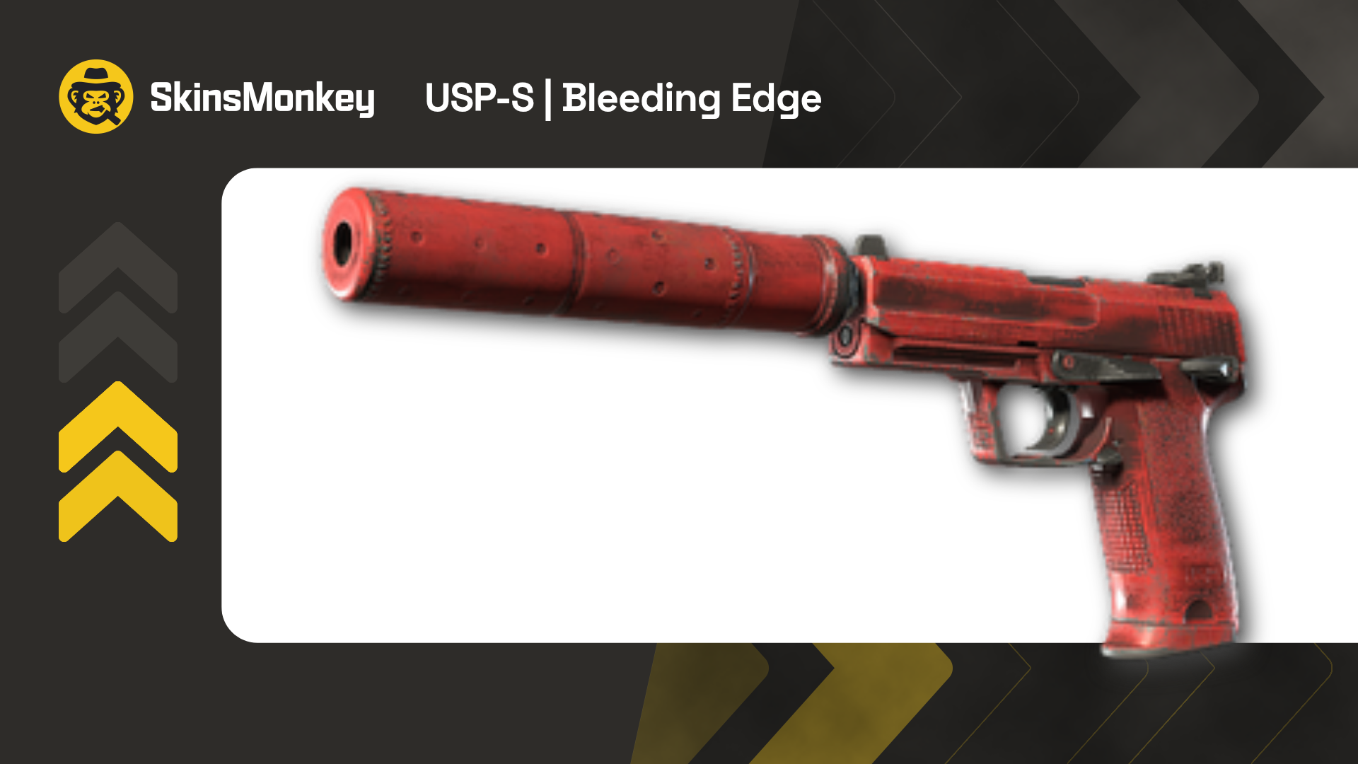 If you're looking for red USP-S skins at a budget, the USP-S Bleeding Edge can be yours for $3.30. Its design makes it fit great with a ruby knife, or any of the red knife skins in the game. If you're looking for a more luxurious alternative, USP-S Kill Confirmed is available for $75 in Field Tested condition.