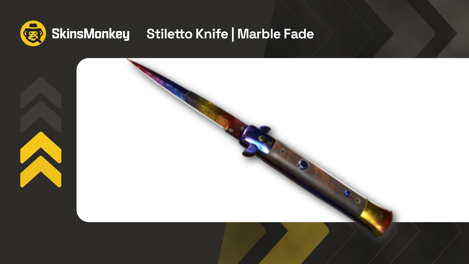 If you're looking for rainbow CS2 skins, Marble Fade knives will be a great addition to your loadout. Stiletto Knife Marble Blade features a rainbow of different colors, with blue, red, and yellow hues all over the weapon skin.