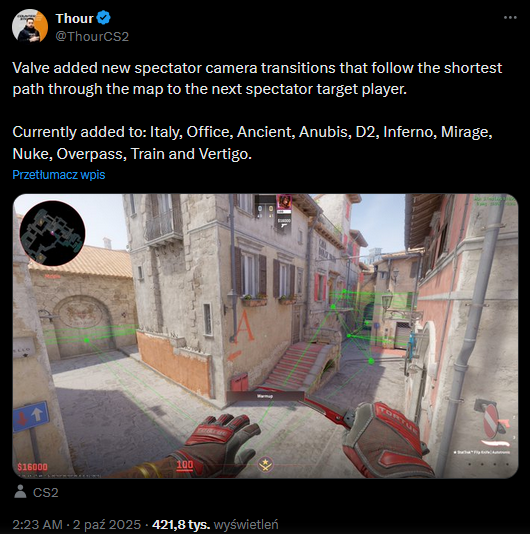 One of the small yet significant changes added to the game is the new spectator cam features. The new CS2 update brings smoother camera transitions on select maps, letting spectators follow targets along the shortest paths for a more natural viewing experience. It also streamlines gameplay visibility by automatically closing spectated player loadouts at the end of each match, keeping the focus sharp and uncluttered during post-game moments.